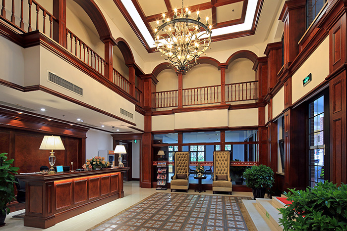酒店主体建筑是汲取青岛优秀历史建筑元素打造的欧式建筑群,室内由美国威尔逊设计事务所主创、国际著名室内设计师James Carry(曾经主持过极富盛名的阿联酋棕榈岛亚特兰蒂斯酒店和位于南非的迷失之城酒店)亲自主持酒店室内设计,拥有4850平方米国际会议中心和431间精心配置的客房。