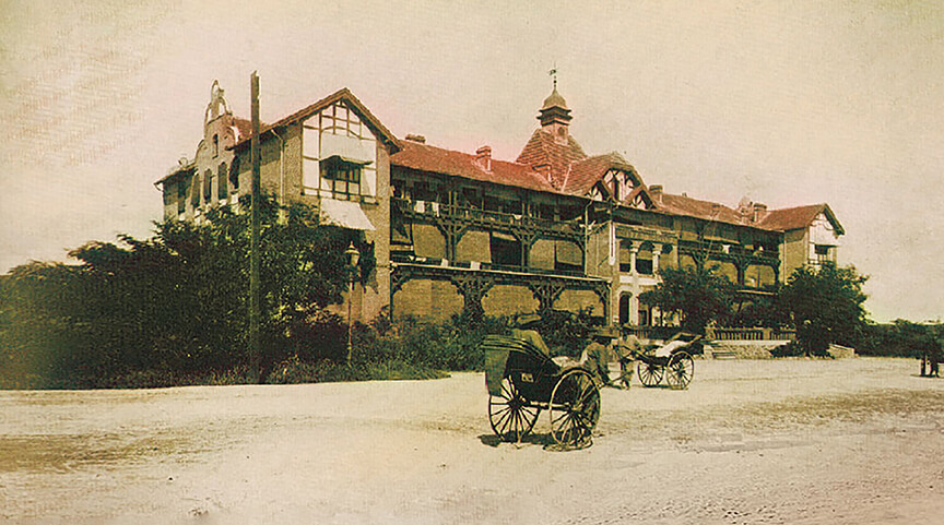 1897年德国占领胶州湾之后,开辟了奥古斯特-维多利亚湾海滨浴场(今第一海水浴场),这里迅速成长为远东著名的度假区。1903年由德国商人和银行家合资的青岛饭店股份协会在度假区投资建设了青岛第一家度假酒店——海滨旅馆。旅馆建筑平面呈“H”型布局,砖木结构,带有德国新浪漫主义和青年派风格特征。酒店也随着德国人的大力宣传而声名远播,成为东亚首屈一指的高端酒店。