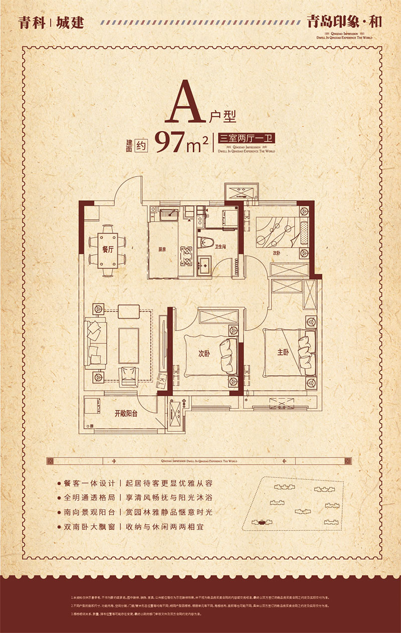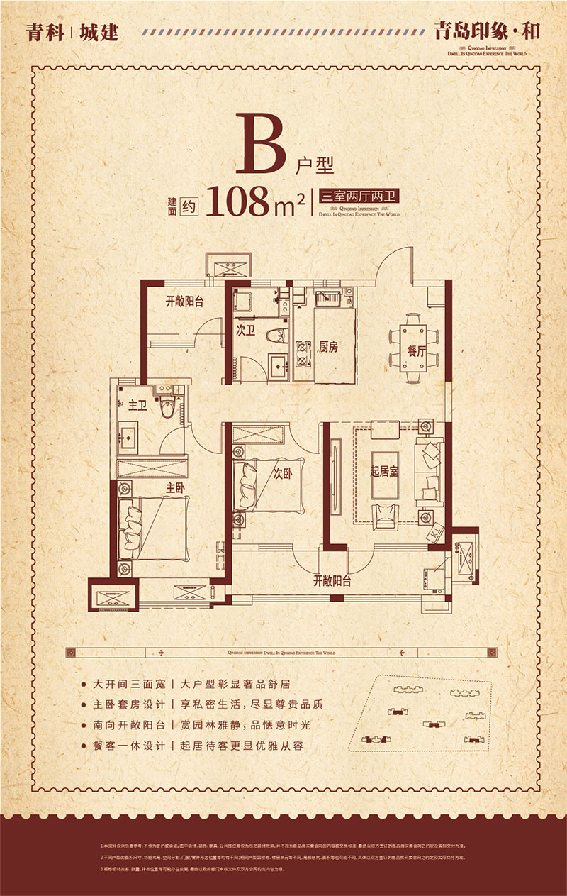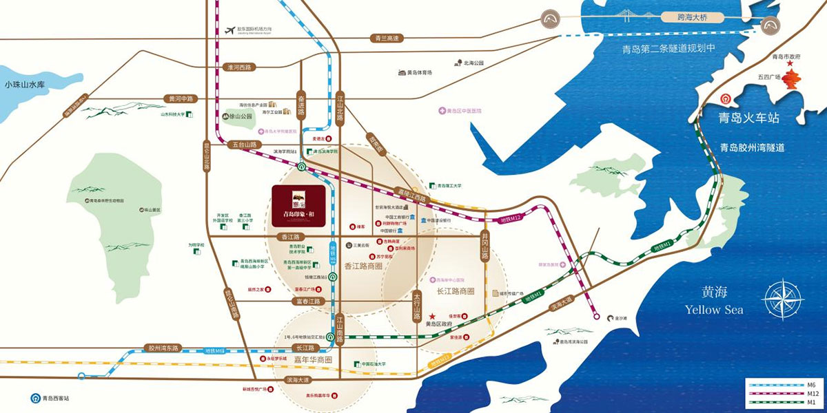 地处西海岸新区城芯主轴香江路,位于小珠山麓、唐岛湾滨海公园畔,屹立岔河生态公园旁,毗邻三大商圈和多个大型商超,5横4纵的交通路网+地铁1号线/6号线+多线路公交接驳青岛,近邻高端医疗配套青岛大学附属医院,是一座集综合住宅、开放商业街区为一体的生态品质大城。项目规划了7栋瞰河高层,住宅共计1090户。以及自建约5万方活力商街 。青岛印象·和建面约96-140㎡香江路·城芯正轴大盘,生态品质大盘。