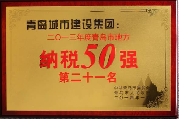 2013年度青岛市地方纳税50强企业于2014年1月24日发布。青岛城市建设集团与海尔集团、海信集团、万科青岛、青岛港集团等企业一起再次名列榜单。省委常委、市委书记李群,市委副书记、市长张新起为50强企业授牌。