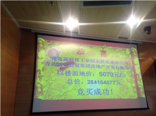 1月27日,青岛浮山新区黄金地块在青岛市公共资源交易大厅举行拍卖,该地块位于浮山后同安路以北,劲松五路以东,占地面积24368.8平方米,规划面积56048.24平方米。最终由青岛城市建设集团房地产开发有限公司与青岛高科技工业园东盛实业总公司联合竞得。