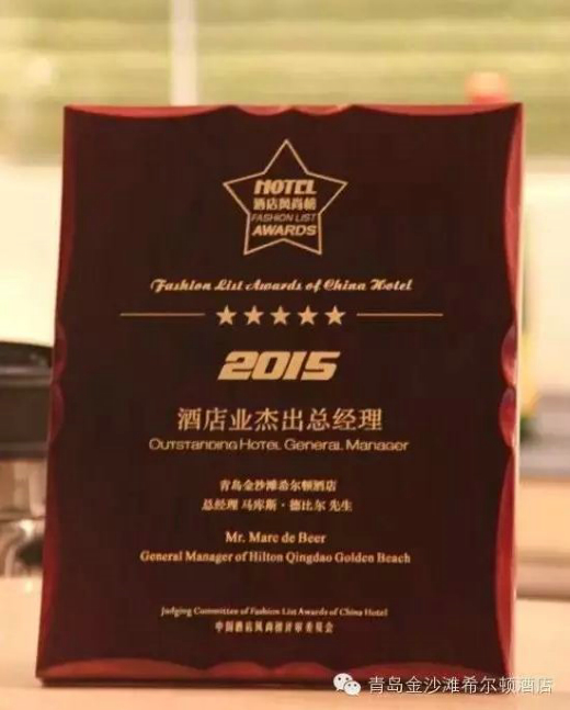 同时,酒店总经理马库斯•德比尔先生荣获其酒店业杰出总经理奖项。德比尔先生于2004年加入希尔顿全球,曾担任沙特阿拉伯吉达希尔顿酒店运营总监,还负责吉达华尔道夫酒店QasrAl Sharq的2006年的盛大开业。2014年3月被任命为青岛金沙滩希尔顿酒店总经理,以他独特得管理方式带领酒店逐步发展成青岛最高端的酒店。