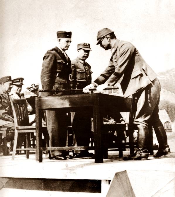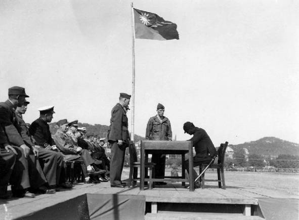 1945年10月25日,青岛地区日军受降仪式在汇泉跑马场举行。国民政府军政部胶济区特派员陈宝仓中将和美国海军陆战队第六师司令谢勃尔少将主持了典礼,日军投降代表第五独立混成旅团长长野荣二少将在投降书上签字并呈现军刀。10月26日出版的《青岛公报》刊文称,长野荣二签字时“面容惨淡,手颤不已。”