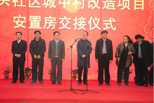 (李沧区张杰区长、市房地产开发管理局丁伟局长以及各有关部门负责同志共同出席湾头社区改造项目一期安置房交接仪式)