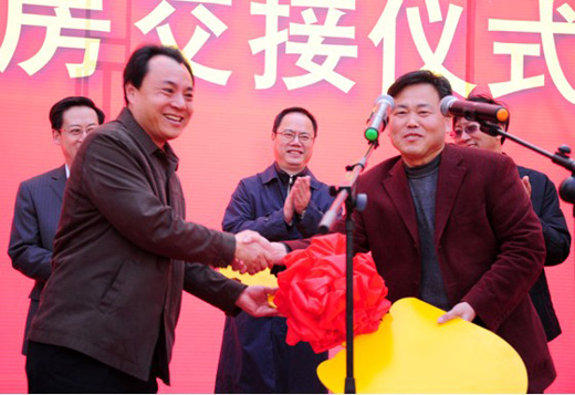 (青岛城市建设集团房地产开发有限公司总经理李忠显向湾头社区居委会党支部书记王修山交接安置房屋钥匙)