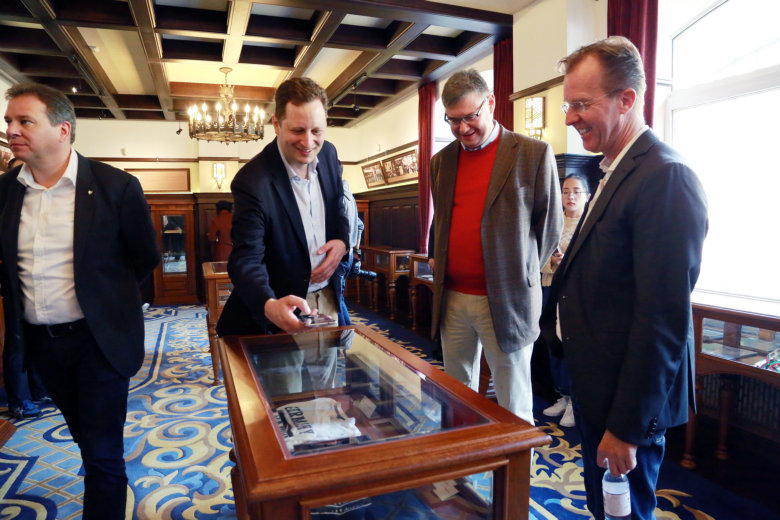 访问团首先参观了青岛印象博物馆,王子对百年前德国在青岛建设的建筑和街道十分关心。在得知大部分德国建筑都得到了妥善保护和利用之后,他表示非常的激动和意外。参观途中王子指着海因里希亲王骑马的照片说:“这是我曾祖父的弟弟,也是我们家族第一个到青岛来的人,而我是第二个。”并要求在照片处合影。王子表示自己曾经服过兵役,所以对军事和历史非常感兴趣,青岛的城市历史和博物馆里的展品更是勾起了自己关于家族的回忆。