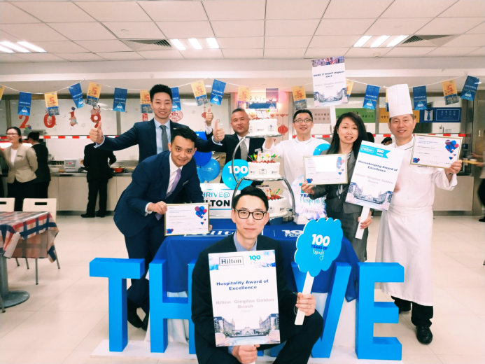 这些漂亮数字的背后,由礼宾部同事无数次辛勤运送行李时的汗珠聚成,由前台同事对宾客发自内心的微笑拼成,由管事部大姐们手中晶亮的餐具堆成,由餐饮部的小姑娘小伙子们每天过万的步数攒成,由客房部大姐们对理房品质的精益求精而成,由商务部的同事们风雨无阻的奔波而成,也由厨房的同事用心烹制而成,还有二线的小伙伴们全能的帮工里满满形成。如酒店总经理梁欣先生所说:这三个奖属于2018年每一位从未放弃努力的金沙滩希尔顿全体团队。