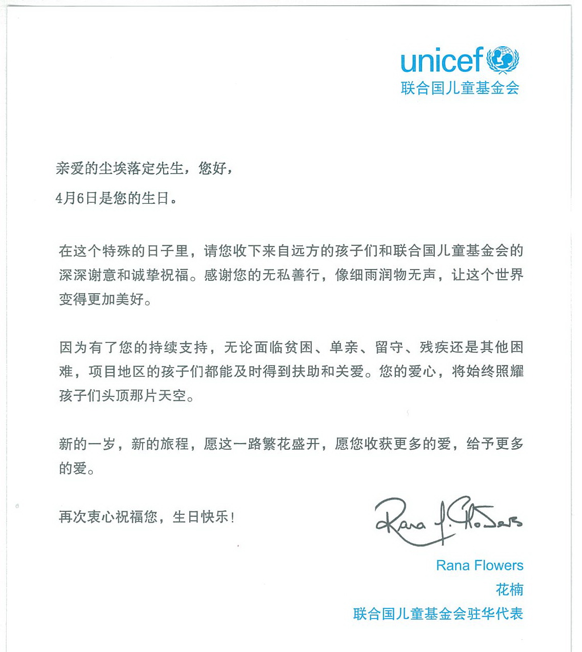 近日,一封来自于联合国儿童基金会驻华代表处的信件,为集团公司的某位神秘同事送上了生日祝福,表达了对这位同事关爱远方孩子们的感谢。