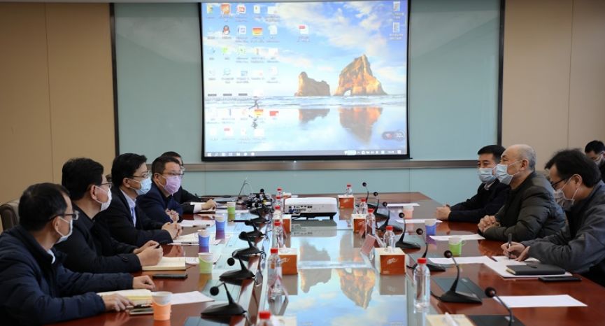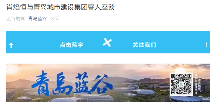3月5日下午,青岛蓝谷管理局局长、党委副书记肖焰恒与青岛城市建设集团董事长孔少武一行进行座谈,双方就合作项目开复工相关事宜进行沟通交流。副局长贾强陪同。