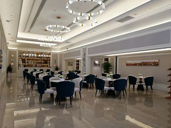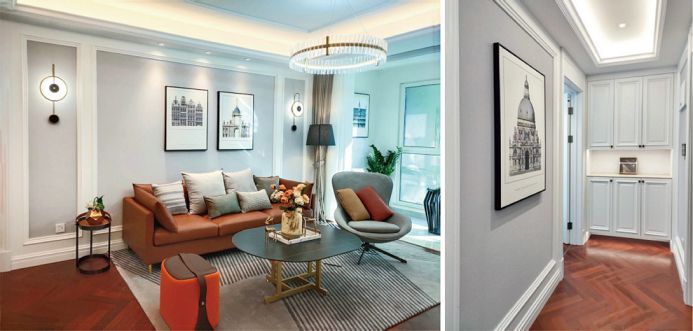 青岛印象·滟的营销中心室内装饰在青岛印象传统风格的基础上,整体采用了现代风格,以白色为基调,浓郁质感的浅灰色壁布,搭配以浅蓝色木作,上覆沉稳的金属质感的灯具,使整个售楼处显得简约时尚,洋溢着清新的青春之风。