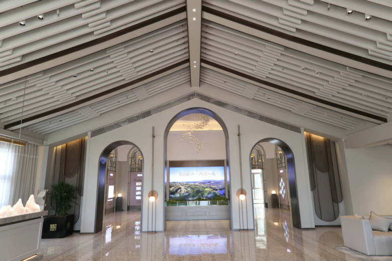 进入营销中心,迎面而来的是宽敞的接待大厅,左首接待,右首挑空。十余米的顶部延续波浪造型,以流线为装饰,自然延至楼下。墙上铺纯白色木作,挂金属质感壁灯,简约而时尚,质感而厚纯。直走穿过“川”字形高挑拱门,一幅群山环抱、河海尽览的实景图呈现眼前,在山海之间,青岛印象·川赫然矗立。中间是项目的区位沙盘,四周为集团的品牌介绍,36年的专注开发与公益情怀,让每一位客人肃然起敬。