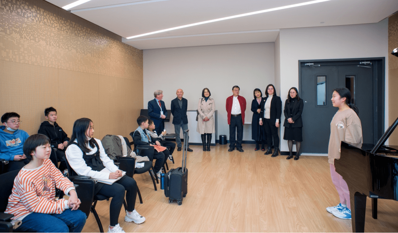于芃一行首先听取了执行校长郑冉关于师资、教学、校园设施等方面的汇报,以及外方校长Mark Stringer关于音乐特色课程的介绍,参观了学校的音乐教学楼、音乐厅、排练厅、琴房等设施,并观看了正在进行的音乐课教学,高度评价了学校一流的硬件设施、顶尖的专业师资力量和领先的教育理念。