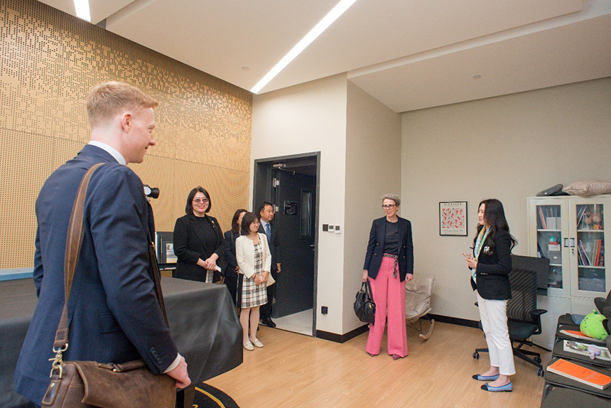 马洁茹一行参观了学校的音乐与文化教学设施,对学校优越的地理与校园环境、世界级水准的教学设施、特别是经过专业设计的优良声学空间表示由衷地赞叹,还深入观摩了正在进行的音乐专业教学,并详细询问了学校的课程体系、教学模式以及学生的升学与发展情况。她表示,青岛梅纽因学校的教学既有着英国教育的严谨、专业,同时也充分结合了中国的文化特色,能够根据学生的不同学段甚至每个人的不同特点进行教学,这是非常宝贵的实践经验,也体现着“全人教育”理念在这里被充分地贯彻;这所学校仅仅用了三年的时间就取得非常令人惊叹的成果,是我们中英文化教育合作领域的典范,英国驻华使馆也将继续全力支持青岛梅纽因学校不断获得更加广泛的国际资源并实现更大发展。