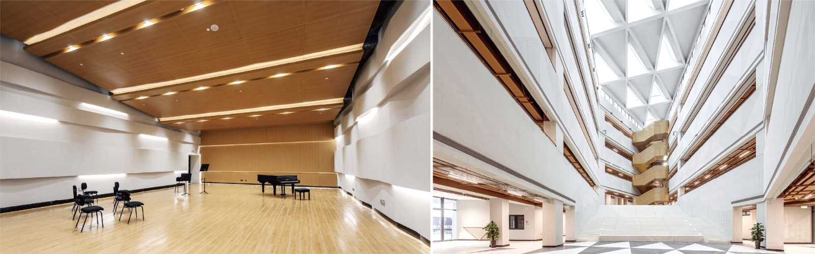 该项目的建筑充满音乐的韵律、节奏和灵动,并结合音乐演奏的严谨结构与艺术形式,不仅如此,鉴于声学设计对高水准音乐特色学校的重要性,特别邀请到国际音乐声学大师丰田泰久亲自主持声学设计,在学校每一个表演空间,声学设计与建筑设计多次碰撞完美结合,甚至每一块木材的水分含量、每一个座椅的针织厚度都经过精密的计算,共同构成对声学的极致追求。